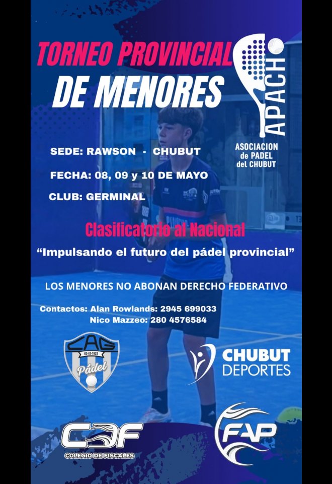 »» Evento: TORNEO PROVINCIAL DE MENORES - RAWSON - CHUBUT »» Localidad: Rawson »» Fechas: 08/05/2026 al 10/05/2026
