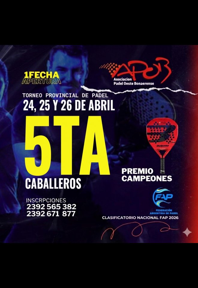 »» Evento: 5TA CAT HOMBRES APOB 2026 1RA FECHA APERTURA »» Localidad: Trenque Lauquen »» Fechas: 24/04/2026 al 26/04/2026